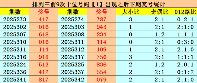 十位号码:十位上期开出偶数、小 号、1路号码:1,历史上十位号码1共开出738期,上一次出当今第2025341期,上期奖号遗漏值为1期。