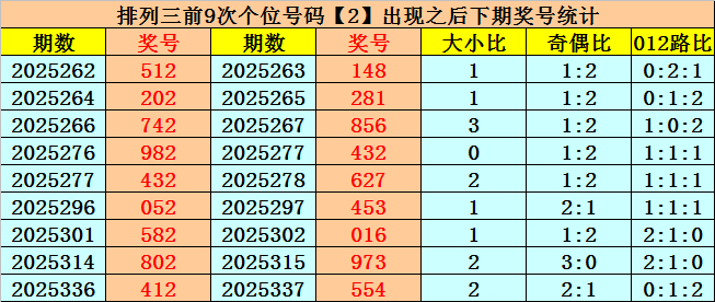 个位号码:上期奖号为小 号、偶数、2路号码:2,历史上个位号码2共开出737期,前一次出当今第2025336期,上期遗漏6期再出。