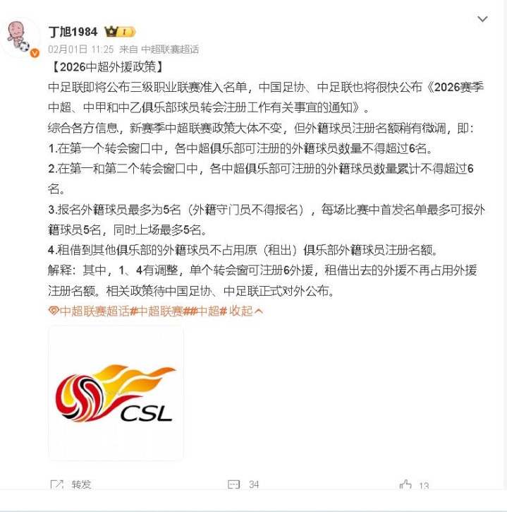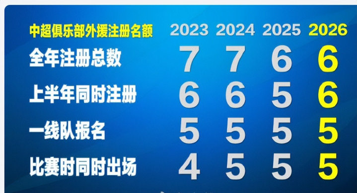 2026赛季中超联赛尚未开赛,外助政策的微调已激发球迷热议。中国足协说明,新赛季外助注册章程将从“6555”颐养为“6655”,即全年累计注册6名外助、单窗口最多注册6东说念主、单场报名5东说念主、同期登场5东说念主。这一颐养看似数字游戏,实则荫庇俱乐部政策布局的深层逻辑,致使可能重塑联赛竞争模样,确切如斯吗?