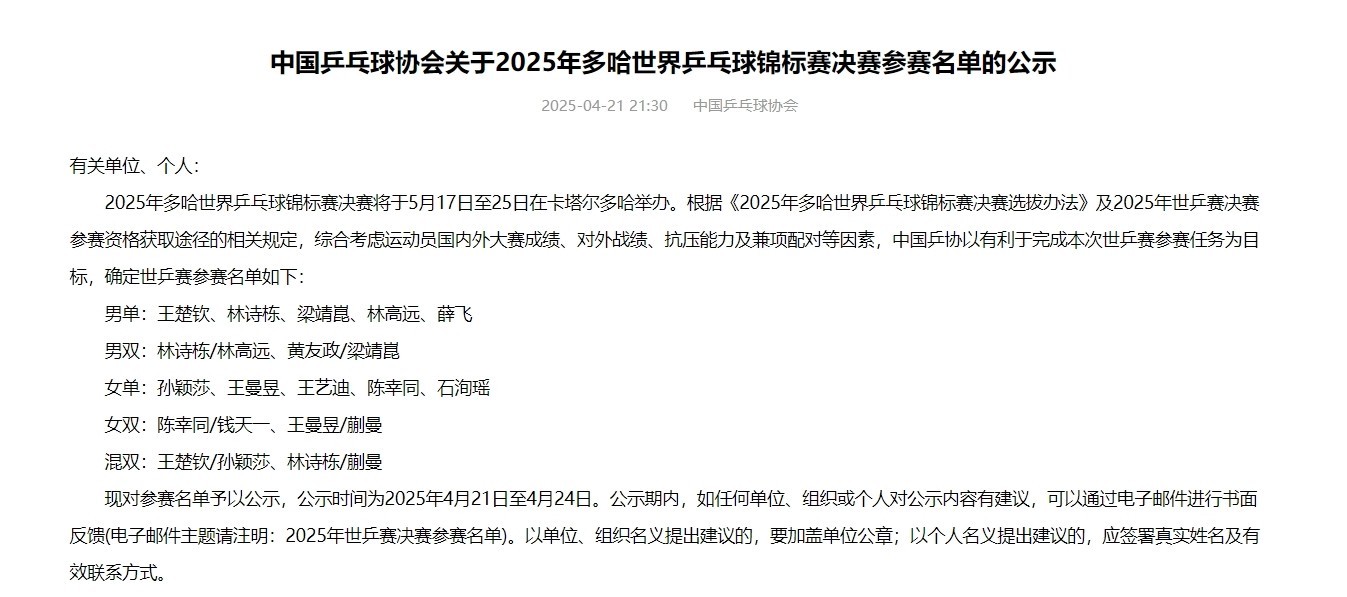 据蒯曼父亲直播深刻,蒯曼打完世界杯后连夜赶回,又连打四场里面选拔赛,最终无缘世乒赛单打限额。石洵瑶在10选1的厉害竞争中脱颖而出,凯旋搭上末班车。不外这和女队主帅马琳的的表述稍有进出,马琳深刻干预选拔赛的共有9东谈主,辞别是蒯曼、钱天一、陈熠、何卓佳、石洵瑶、王晓彤、覃予萱、刘炜珊、朱梓予。比赛取舍淘汰赛制,石洵瑶先后治服何卓佳、刘炜珊、陈熠在选拔赛中夺冠,赢得单打阅历。