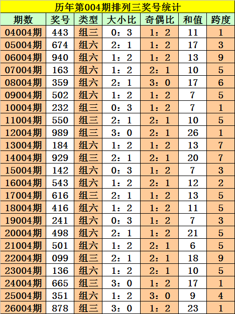 摆列三第2026004期奖号:878,和值23,跨度1,大小比3:0,奇偶比1:2。