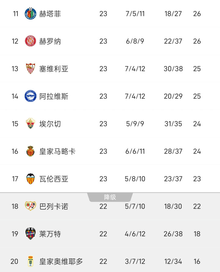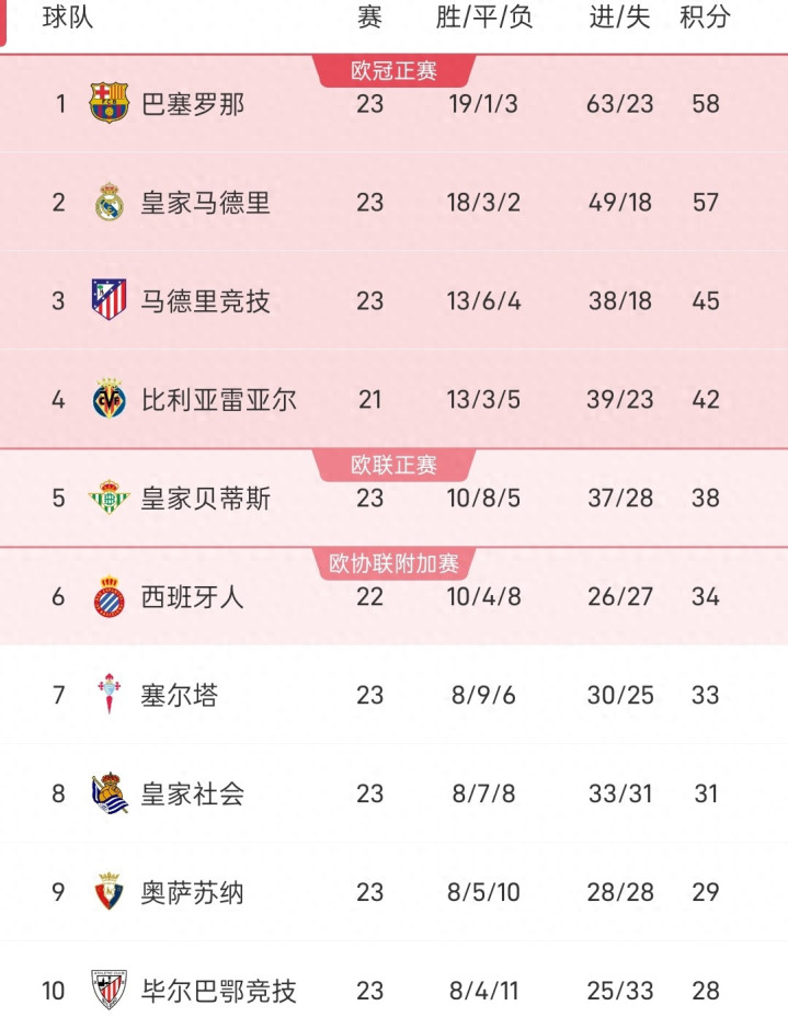 2月9日西甲联赛第23轮比赛,皇马2-0瓦伦西亚,马德里竞技0-1贝蒂斯,毕包4-2投降莱万特,塞维利亚1-1战平赫罗纳,阿拉维斯0-2赫塔菲,西甲最新积分出炉,巴萨58分力压皇马1分领跑,皇马57分次席,马竞45分排在第三,黄潜42分第4,贝蒂斯38分来到了第五名!