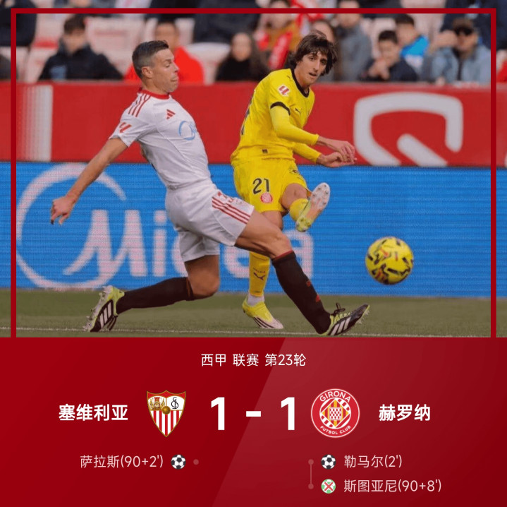 25/26赛季西甲联赛第23轮,塞维利亚1-1战平赫罗纳。上半场勒马尔闪击破门,雷斯禁区内疑似手球未吹。下半场大部分时辰两边均无太好的契机,但参加补时后,萨拉斯宇宙波将比分扳平,随后赫罗纳取得点球契机,但被换上衰退踢点球的斯图亚尼却将球罚丢,错失绝杀契机。最终,塞维利亚主场1-1战平赫罗纳。