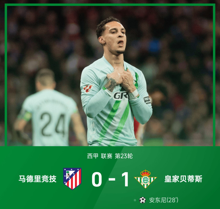 25/26赛季西甲联赛第23轮,皇家贝蒂斯1-0投降马德里竞技。全场比赛,安东尼第28分钟远射破门打入了全场比赛独逐一粒进球,卢克曼上半场头球扳平越位无效;下半场第74分钟,略伦特头球自摆乌龙,主裁判吹罚格列兹曼脚尖体毛越位无效,贝蒂斯1-0复仇马竞。积分榜方面,马竞积45分排行第三,贝蒂斯积38分排行第五。