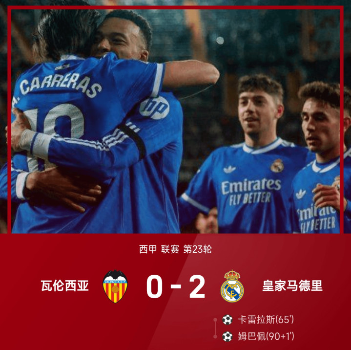 25/26赛季西甲联赛第23轮,皇家马德里客场以2-0投降瓦伦西亚。上半时比赛,两边齐未能取得进球;下半时比赛,卡雷拉斯和姆巴佩携手立功,助皇马取得3分。皇马在取得这场比赛收效后,也在联赛里豪取7连胜。积分榜方面,皇马联赛7连胜57分过时榜首巴萨1分,瓦伦西亚23分第17。