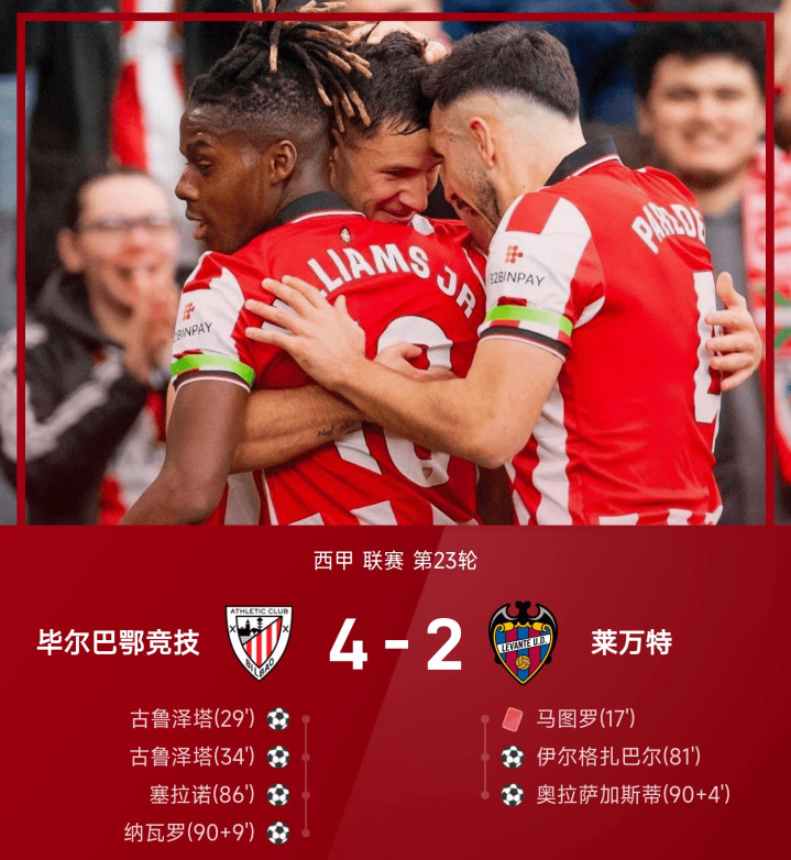 25/26赛季西甲联赛第23轮,毕尔巴鄂竞技镇守主场迎战莱万特。上半场,第17分钟,莱万特开局失利。马图罗看重破碎I.威廉姆斯单刀严重犯规染红,莱万特少打一东说念主。随后第29分钟,古鲁泽塔头球破门破碎僵局。第34分钟,古鲁泽塔如有神助推射破门再进一球完成梅开二度。下半场易边再战,终末阶段第81分钟,莱万特反击,伊尔格扎巴尔乱战中倒挂挑射破门扳回一城。第86分钟,塞拉诺低射破门再将上风扩大。补时第90+4分钟,莱万特莫得毁灭抵挡,奥拉萨加斯蒂宇宙波破门打进死角拉进比分。第90+9分钟读秒阶段,I.威廉姆斯直塞助攻,纳瓦罗压哨抽射破门锁定战局。最终,伊尔格扎巴尔、奥拉萨加斯蒂破门难救主,毕尔巴鄂竞技4-2投降十东说念主莱万特。